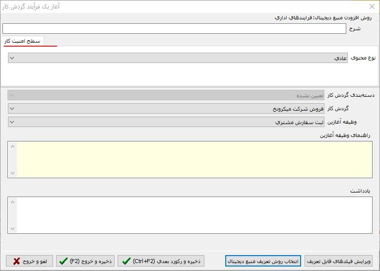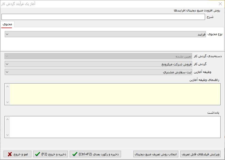 نکته: در اینجا ممکن است این ابهام ایجاد شود که با وجود امکان تعریف فیلدها در گردش کارها، می توانیم یک فیلد با نام نوع محتوا تعریف کنیم. در این صورت چه نیازی به استفاده از نوع محتوای منابع دیجیتال داریم؟ جواب این است که نوع محتوا در سطح پایگاه تعریف می شود و مستقل از گردش کارهاست. بنابراین دیگر نیازی به تعریف مکرر یک فیلد در گردش کارهای متعدد نداریم. بعلاوه اینکه با این روش حالت یکدستی در استفاده از نوع محتوا در گردش کارهای متعدد بوجود می آید .