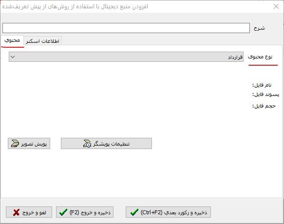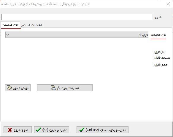 از آنجایی که سرشاخه کارها در آرشیو منابع دیجیتال فاقد فایل است لذا این برگه تنها برای پیوستها معنی پیدا می کند. در این برگه (شکل زیر) روش تعیین فایل پیوستها و مواردی وابسته به این فایلها تنظیم می شود: