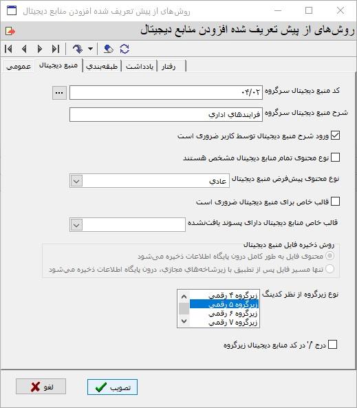 نوع زیرگروه از نظر کدینگ: در این قسمت تعداد زیرگروه سرشاخه مشخص می شود. برای مثال اگر برای سرشاخه کارها، زیرگروه سه رقمی انتخاب شود یعنی اینکه یک کار می تواند تعداد 999 پیوست داشته باشد. یا مثلا اگر برای سرشاخه گردش کارها زیر گروه 4 رقمی انتخاب شود به این معنی است که هر گردش کار، حداکثر می تواند شامل 9999 کار باشد. بدیهی است این گزینه تنها برای گردش کار و کارها معنی دارد زیرا سرشاخه هستند و می توانند زیرگروه داشته باشند اما این گزینه برای پیوستها بی معنی است چون قرار نیست پیوست سرگروه باشد (پیوستها سطح آخر درخت منابع دیجیتال هستند).