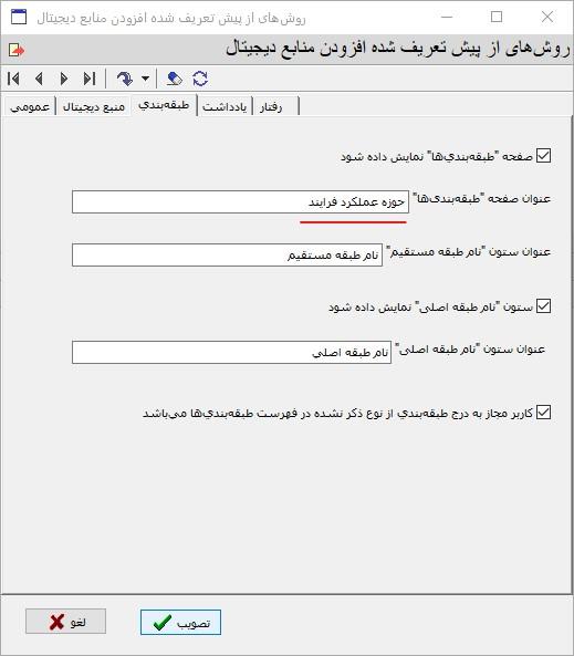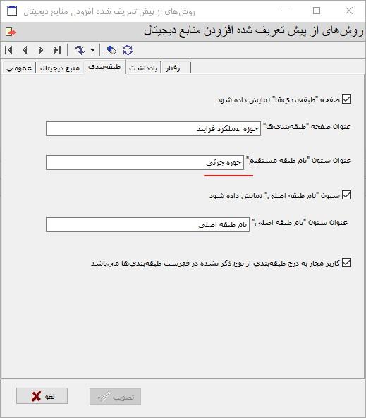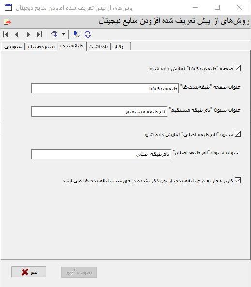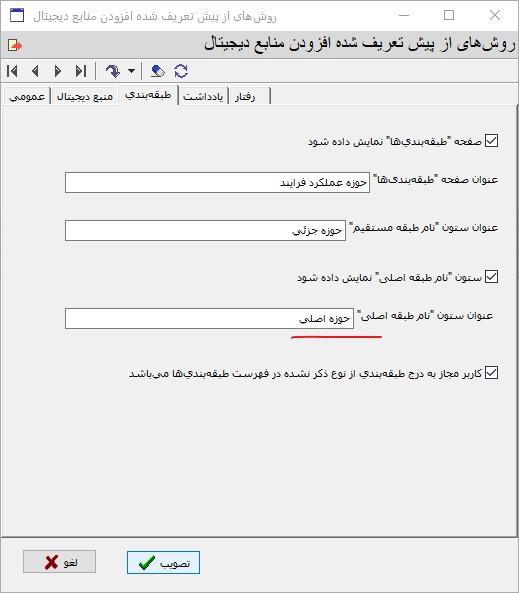 در تنظیمات این برگه (شکل زیر)، تعیین می شود که در هنگام آغاز یک کار جدید، این کار در کدام شاخه از طبقه بندی منابع دیجیتال قرار بگیرد: