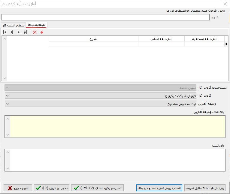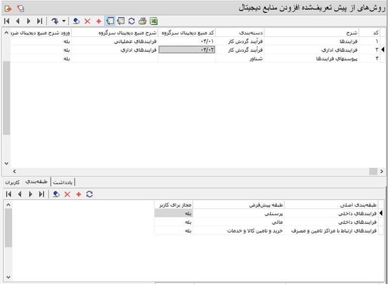 نکته: با توجه به توضیحات بالا، برای امکان افزودن پیوستها لازم است که حتما یک روش از پیش تعریف شده با دسته بندی شناور تعریف کنید.