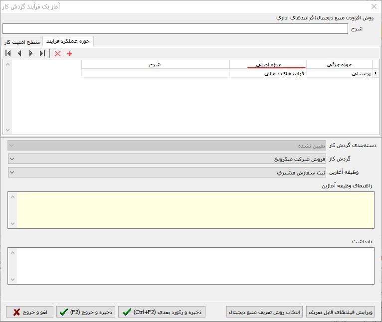 درج "/" در کد منابع دیجیتال زیرگروه: در درخت منابع دیجیتال، کد هر منبع، ترکیبی از کد منبع و کدهای سرگروههای آن منبع است. برای مثال کد یک پیوست ، ترکیبی از کد گردش کار، کار و پیوست است. حال اگر این گزینه را انتخاب کنید، بین کدهای سطوح سرگروه یک علامت "/" درج می شود که این قابلیت نوعی ویژگی دسته بندی به کد اضافه می کند. برای مثال به کد یکی از کارها در شکل زیر توجه کنید: