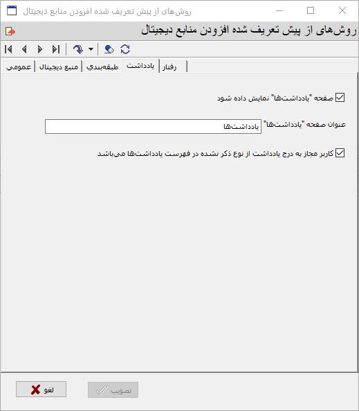 در این برگه (شکل زیر)، تنظیمات مربوط به استفاده از یادداشتهای منابع دیجیتال در ایجاد یک منبع دیجیتال جدید انجام می شود: