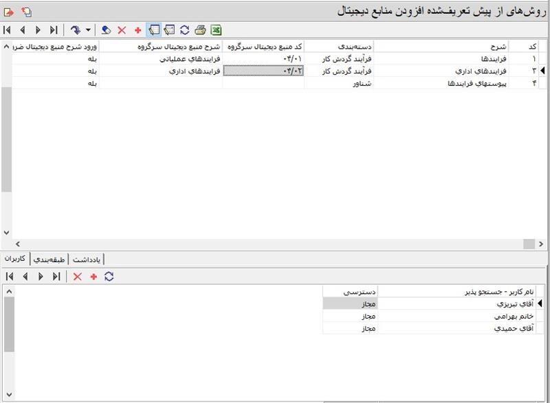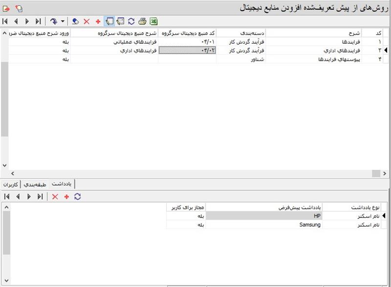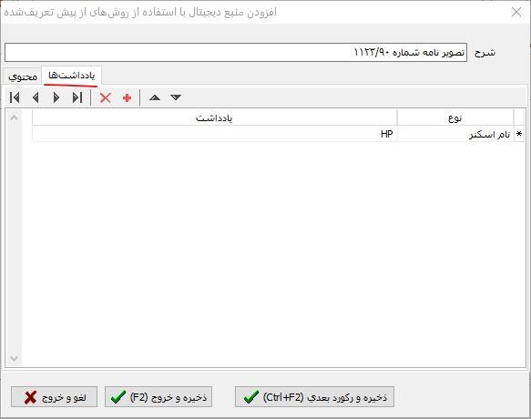 در این ناحیه، یادداشتهایی را ملاحظه می کنید که مدیر سیستم برای کاربر مجاز کرده است. این فهرست، زیرمجموعه ای از کل یادداشتهای منابع دیجیتال در آرشیو می باشد. در حالت عادی، کاربر می تواند یکی از یادداشتهای مجاز موجود در این فهرست را انتخاب نماید. اما با فعال کردن این گزینه، کاربر می تواند، از میان یادداشتهای منابع دیجیتال، یک نوع یادداشت دیگر را به دلخواه خود انتخاب و یادداشت مورد نظر خود را وارد کند.