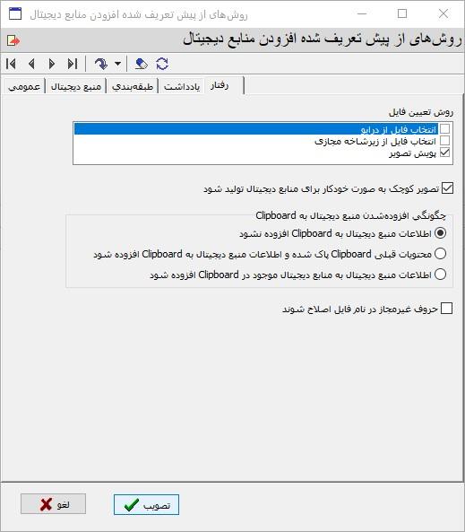 چگونگی افزوده شدن منابع دیجیتال به Clipboard: در این قسمت تنظیمات انتقال پیوستها به Clipboard انجام می شود. توضیح این که این کار برای استفاده از پیوستها در یک سیستم دیگر (مثلا سیستم یکپارچه مالی نوسا) استفاده می شود. در هر صورت یکی از سه گزینه زیر را باید انتخاب کنید: