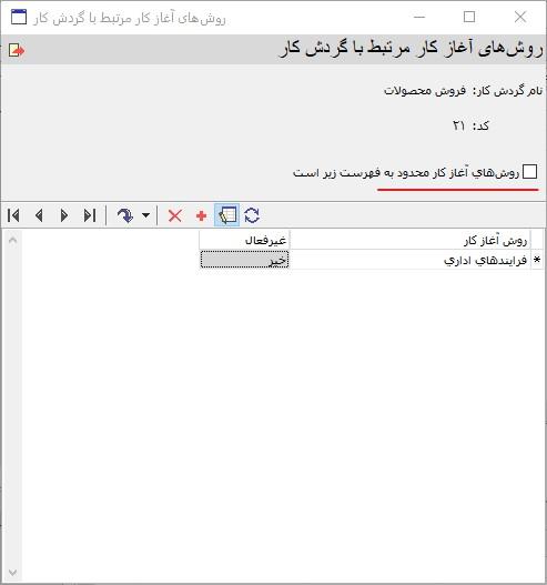 پس از تعریف روشهای آغاز کار، حال باید برای هر گردش کار تعیین کنید که با چه روشهایی می توانیم کار را آغاز کنیم. برای این کار در محاوره تعریف و اصلاح گردش کارها، مطابق شکل، گردش کار مورد نظر خود را انتخاب کنید و سپس روی آیکون