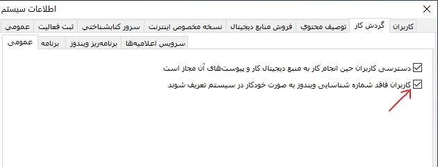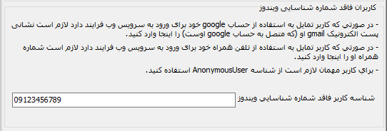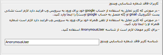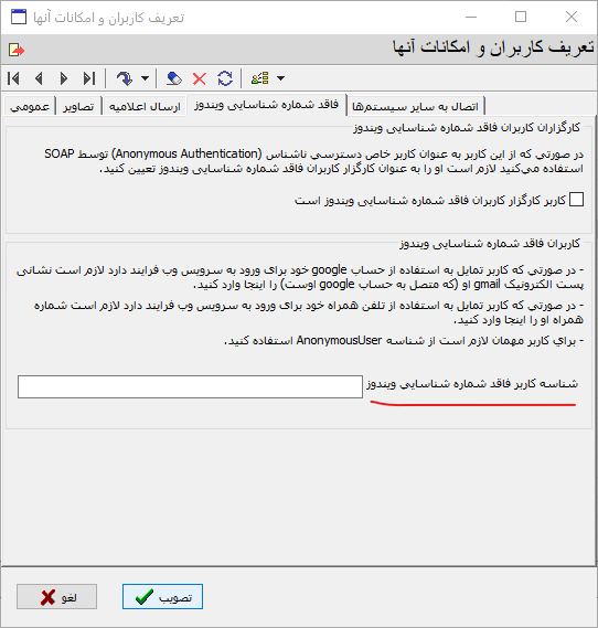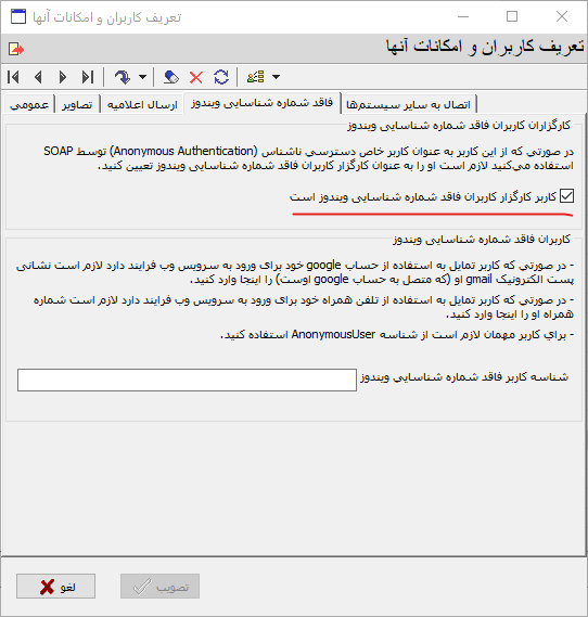 برای هر کاربر فاقد sid باید یک شناسه اختصاصی تعیین کنیم. این شناسه در محاوره تعریف کاربران و امکانات آنها و در برگه "فاقد شماره شناسایی ویندوز" به شکل زیر تعریف می شود: