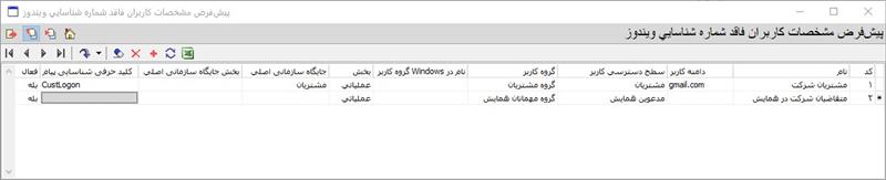 همانطور که ملاحظه می کنید در این پایگاه، برای هر نوع از کاربران فاقد شماره شناسایی ویندوز، سری مشخصات پیش فرض جداگانه تعریف شده است. کد 1 مربوط به کاربران دارای حساب گوگل است که مشتریان شرکت را تشکیل می دهند و کد 2 مربوط به کاربرانی است که از طریق شماره موبایل در سیستم تعریف می شوند و درخواست کنندگان شرکت در همایش هستند. مشخصاتی که برای هر مورد تعیین می شود به شرح زیر است: