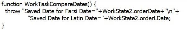 یادآوری می شود که این تاریخ در هنگام ذخیره شدن، بطور اتوماتیک تبدیل به مقدار میلی ثانیه از مبدا تاریخ شده و در پایگاه ذخیره می شود. برای نمونه در اینجا از طریق یک تابع اجرایی به شکل زیر، مقدار ذخیره شده فیلدهای تاریخ سفارش فارسی و لاتین نمایش داده شده است: