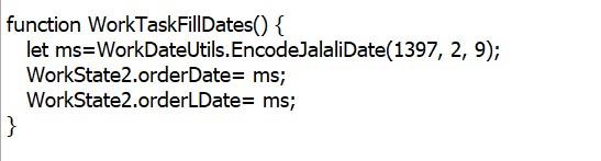 ملاحظه می کنید که ابتدا از طریق EncodeJalaiDate مقدار خالص تاریخ شمسی بدست می آید و سپس از طریق توابع getFullYear، getMonth و getDate مقادیر لاتین سال، ماه و روز تاریخ استخراج می شود و سپس با استفاده از این سه مقدار، رشته حرفی فرمت تاریخ به فرم میلادی تولید و در متغیر strDate قرار می گیرد و در نهایت مقدار این متغیر در Value قرار می گیرد.