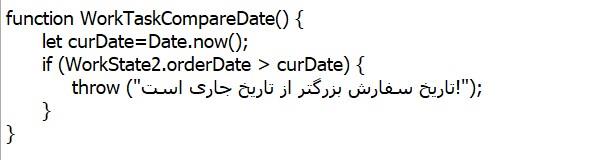 مثال 1- مقایسه با تاریخ جاری: فرض کنید در یک گردش کار فروش کالاها، می خواهیم تاریخ سفارش را کنترل کنیم و اگر این تاریخ بزرگتر از تاریخ جاری بود، پیغام خطا نمایش دهیم. در اینجا لازم است همانند تابع اجرایی زیر، تاریخ جاری را با تاریخ ثبت سفارش مقایسه کنیم.