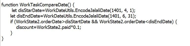 مثال 2- مقایسه با یک تاریخ دلخواه: فرض کنید در یک گردش کار خدمات پس از فروش، می خواهیم برای تمام مشتریانی که در یک بازه تاریخی خاص (جشنواره فروش) خرید کرده اند، بخشی از پرداخت را به عنوان تخفیف به مشتری برگردانیم. تابع اجرایی زیر نمونه ای از این مثال را نشان می دهد: