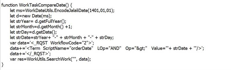مثال1 – جستجوی تاریخ میلادی: فرض کنید می خواهیم فهرست تمام کارهای گردش کار درخواست کالا را که تاریخ سفارش آنها سال جاری میلادی است جستجو کنیم. در این صورت باید همانند تابع اجرایی زیر عمل کنیم: