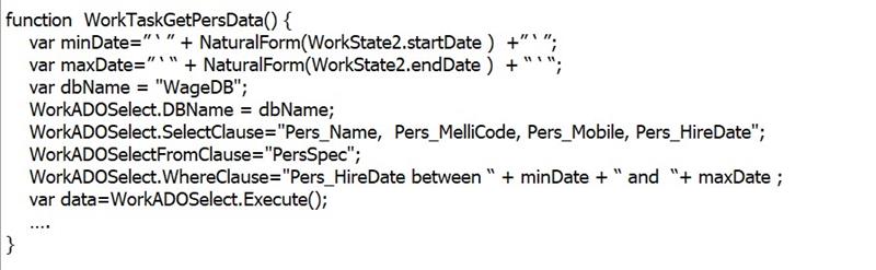 در این تابع ابتدا محتوای دو فیلد تاریخی شروع و پایان بازه تاریخی توسط تابع NaturalForm به رشته حرفی میلادی تبدیل شده اند و سپس این دو رشته به شکل متغیر در WhereClause قید شده است. یادآوری می شود که برای Query تاریخ در Sqlserver باید حتما به شکل رشته حرفی میلادی باشد.