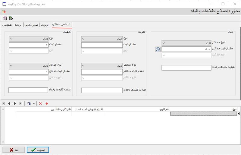 همانطور که مشاهده می کنید یکی از برگه های این محاوره، برگه شاخص عملکرد است که شامل معیارهای سه گانه زمان، هزینه و کیفیت عملکرد وظیفه می باشد.