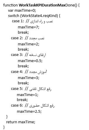 همانطور که ملاحظه می کنید نام این تابع دارای پیشوند WorkTaskKPIDurationMax است. در این تابع روی گزینه های فیلد نوع درخواست (reqKind) شرط گذاشته شده و با استفاده از متغیر maxTime برای هر نوع درخواست، یک زمان حداکثر مجزا تعیین شده است.
