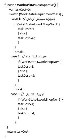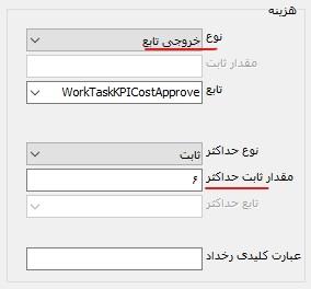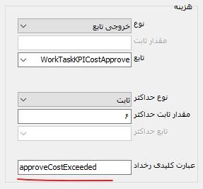 همانطور که ملاحظه می کنید، عنوان تابع حداکثر هزینه، دارای پیشوند WorkTaskKPICostMax است. در این مثال، برای هر دسته از تجهیزات، یک هزینه حداکثر خاص آن دسته تعیین شده است.