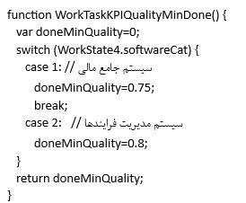 عبارت پیشوند تابع حداقل کیفیت WorkTaskKPIQualityMin است و در این مثال، حداقل کیفیت، بسته به دسته بندی نرم افزار، در متغیر doneMinQuality ذخیره می شود و در نهایت این متغیر خروجی تابع خواهد بود. در شکل زیر این تابع برای تعیین حداقل کیفیت انتخاب شده است: