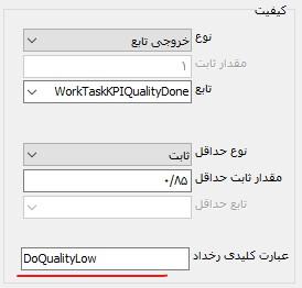 توضیح: در مورد تعیین کیفیت وظیفه نیز باید توجه کنید که ممکن است مقدار ثابت کیفیت توسط کاربر (یا بطور خودکار توسط سیستم) و در حین کار، در یک فیلد قابل تعریف وارد و ثبت شود. در این صورت، خروجی تابع، مقدار فیلد یادشده خواهد بود.