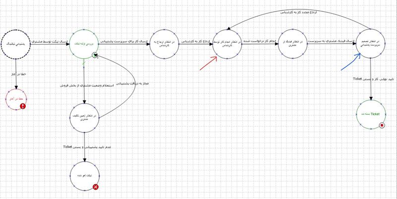 - زمان شناسایی و تعیین تکلیف تیکت: مدت زمان صرف شده از زمان ارسال تیکت توسط مشتری تا ارجاع کار به کارتابل کارشناس را زمان شناسایی تیکت می نامیم. در دیاگرام زیر وضعیت در انتظار انجام کار توسط کارشناس که با فلش قرمز مشخص است، دقیقا وضعیتی است که تیکت شناسایی شده است. در این وضعیت دو وظیفه "اعلام مجاز بودن خدمات پشتیبانی" (توسط کارشناس فروش) و "ارجاع کار به کارشناس" (توسط سرپرست) انجام شده است که مجموع مدت زمانهای انجام این دو وظیفه، زمان شناسایی می باشد. توضیح اینکه این شاخص میزان چابک بودن فرایند پشتیبانی در زمینه سرعت رسیدگی و توزیع تیکتها میان کارشناسان را می سنجد.