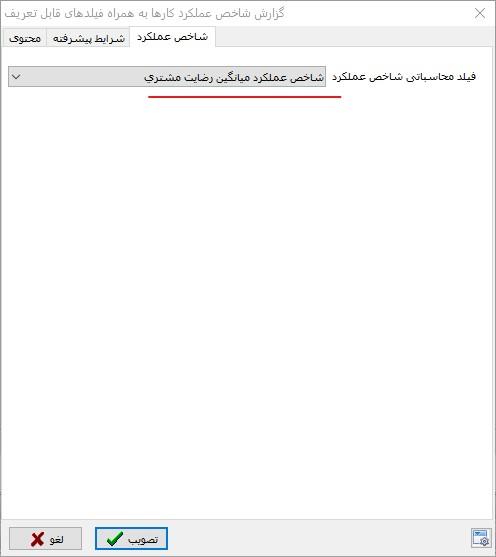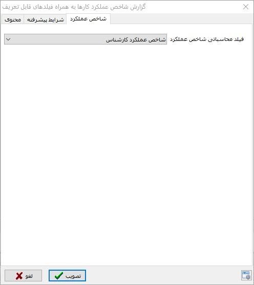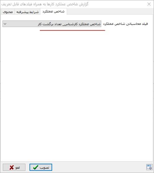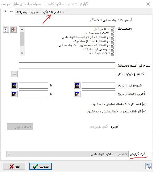 در این محاوره، ابتدا باید فرم گزارش را انتخاب کنید و سپس برگه شاخص عملکرد را که در شکل با فلش قرمز مشخص شده است، باز کنید تا این برگه به شکل زیر باز شود: