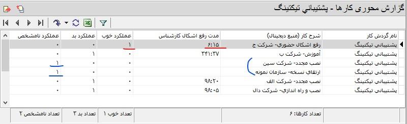 ملاحظه می کنید که از میان شش کار فوق، کارشناس تنها در کار اول (رفع اشکال حضوری- شرکت ج) عملکرد خوب داشته است و علت آن این است که مدت رفع اشکال کارشناس در این کار، برابر با 6:15 است و این مدت در محدوده مطلوب (6 ساعت تا 48 ساعت) قرار دارد. ضمنا دو کار که با خط آبی تفکیک شده اسند، هنوز به مرحله رفع اشکال کارشناس نرسیده اند که عملکرد آنها "نامشخص" گزارش شده است.