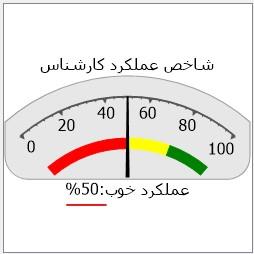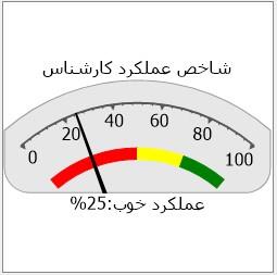 همانطور که مشاهده می کنید، در این شکل، شاخص کل عملکرد کارشناس در مقیاس درصد نمایش داده شده است. این شکل بیانگر این است که 25 درصد کارها، عملکرد خوب داشته است. ملاحظه می کنید که این مقدار در محدوده قرمز قرار دارد و به این معنی است که عملکرد کل کارشناس مطلوب نیست. در طراحی این اندازه گیر، مقادیر تا 50 درصد در محدوده قرمز یا نامطلوب، مقادیر میانگین از 50 تا 75 درصد در ناحیه زرد و مقادیر بالاتر از 75 درصد در ناحیه سبز یا مطلوب قرار می گیرند.