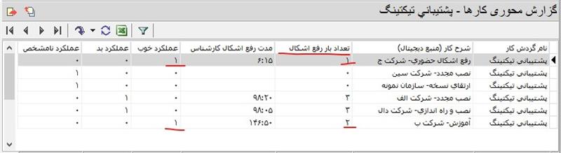 واضح است که این دو شاخص با متفاوتند. برای مثال ممکن است یک رفع اشکال 3 بار تکرار شود تا رضایت مشتری و سرپرست حاصل شود اما مجموع مدت زمانی که در این 3 بار صرف شده مثلا 3 ساعت باشد. در طرف دیگر فرض کنید یک رفع اشکال، تنها یک بار انجام شده است اما در همین یک بار 4 ساعت طول کشیده است. بنابراین دو دیدگاهی که برای شاخص عملکرد کارشناس گفته شد، کاملا معنی دار است و دو شاخص عملکرد برای کارشناس قابل سنجش می باشد. برای این کار باید گزارش خود را به شرح زیر توسعه بدهیم.