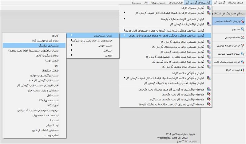 برای نمایش گزارش باید همانند شکل زیر، از منوی "گزارشهای گردش کار"، گزینه "گزارش شاخص عملکرد میانگین کارها به همراه فیلدهای قابل تعریف" را کلیک کنید و سپس از طریق منوی دسته بندی، فهرست گردش کارهای موجود در دسته بندی مورد نظر را باز کنید و در نهایت، گردش کار مورد نظر خود (در این مثال پشتیبانی تیکتینگ) را کلیک کنید: