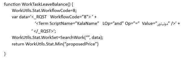 در این مثال، ابتدا با جستجوی کارها از طریق SearchWork ، جامعه آماری را محدود به درخواستهایی می کنیم که کاربر آنها یک شخص خاص (در اینجا Amiri) است و سپس مجموع مرخصهایی را استفاده شده را که در فیلد leaveDays ذخیره شده، محاسبه می کنیم.