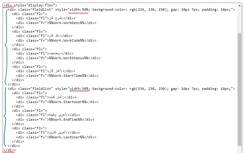 ملاحظه می کنید که یک div خارجی شامل دو div (ستون) با عرض 50 درصد است که ستون اول شامل 4 فیلد است (ناحیه مشخص شده با خط آکولاد سبزرنگ) و ستون دوم شامل 3 فیلد سیستمی است (ناحیه مشخص شده با آکولاد آبی رنگ). نتیجه این کد در محاوره ویرایش فرم چاپی به شکل زیر می باشد:
