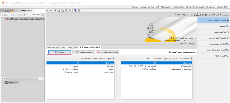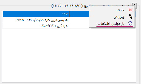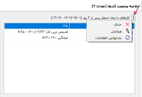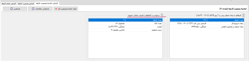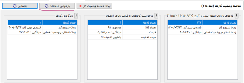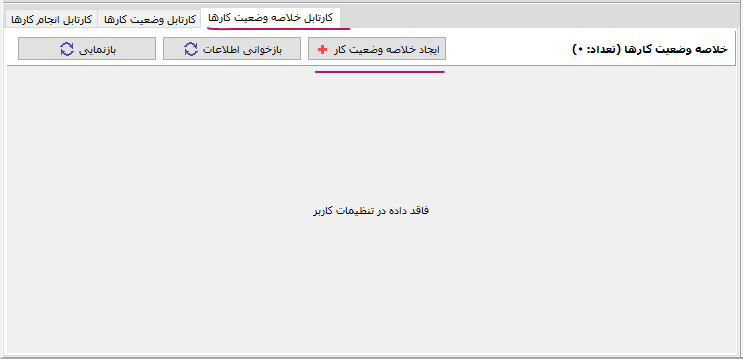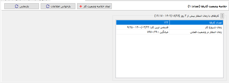 نکته مهم: دقت کنید که از طریق بازخوانی اطلاعات، تنها اطلاعات گزارشهای خلاصه وضعیت بروز می شود و این ربطی به خود فهرست کارها ندارد. به عبارت دیگر فهرست کارها که با دبل کلیک روی گزارش خلاصه وضعیت، نمایش داده می شود همواره بروز است.