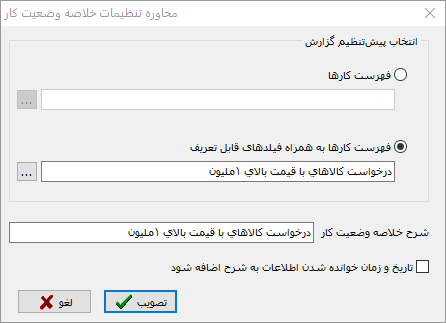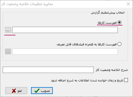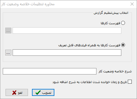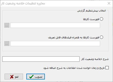 حال در این محاوره، روی تکمه ایجاد خلاصه وضعیت کار کلیک کنید تا محاوره تنظیمات خلاصه وضعیت، به شکل زیر باز شود: