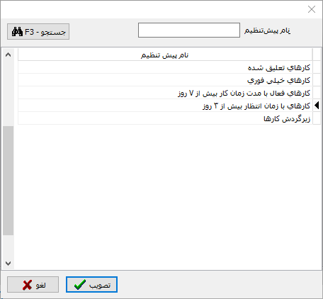 همانطور که ملاحظه می کنید، در فهرست کارهای عمومی، پیش تنظیمها روی فیلدهای عمومی و سیستمی تعریف می شود. حال پیش تنظیم مورد نظرتان را انتخاب کنید. در این مثال، "کارهای با زمان انتظار بیش از 3 روز" را انتخاب می کنیم: