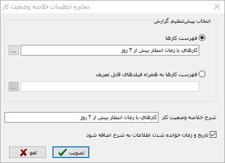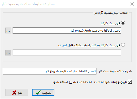 ملاحظه می کنید که عنوان پیش تنظیم، در ناحیه "شرح خلاصه وضعیت کار" کپی می شود. بنابراین بطور پیش فرض نیازی به وارد کردن شرح خلاصه وضعیت نیست اما در مواردی که مثلا طول عنوان پیش فرض خیلی طولانی است یا به هر دلیل دیگر، می توانید این عنوان را به دلخواه خود تغییر دهید. در انتهای این محاوره، گزینه ای وجود دارد که در صورت فعال کردن آن، تاریخ و زمان تهیه فهرست کارها، در شرح خلاصه وضعیت نمایش داده می شود. توضیح این که گزارش خلاصه وضعیت کارها بخودی خود بروز نمی شود و به همین خاطر، کاربر باید از آخرین فراخوانی اطلاعات گزارش مطلع باشد تا براساس آن و در صورت لزوم، بروزرسانی را انجام دهد. به این ترتیب در مورد گزارشهای زمانبر، از بروزرسانی های مکرر و غیرضروری جلوگیری می شود.