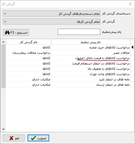 در اینجا لیست پیش تنظیمهای مرتبط با تمام گردش کارها را ملاحظه می کنید. در صورتی که تعداد پیش تنظیمها زیاد باشد می توانید لیست را به گردش کار خاصی محدود کنید اما در این مثال چون تعداد پیش تنظیمها کم است لذا به راحتی می توانیم پیش تنظیم مورد نظر (در این مثال درخواست کالاهای با قیمت بالاتر از 1 ملیون) را انتخاب و محاوره را تصویب کنیم. به این ترتیب محاوره "تنظیمات خلاصه وضعیت کار" به شکل زیر نمایش داده می شود: