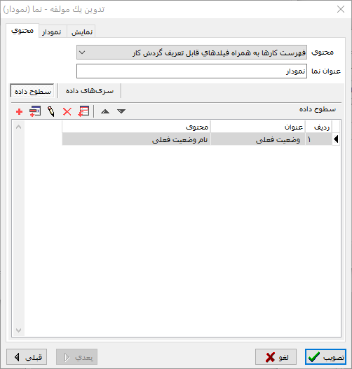همانطور که می بینید، این محاوره از سه برگه تشکیل شده است که در برگه محتوا باید محتوای مورد نظر خود را برای نمایش تعیین کنیم. در این مثال محتوای ما تعداد کارها در گروه ها (وضعیتها) است. افزودن محتوا برای نمودار در دو برگه زیر انجام می شود: