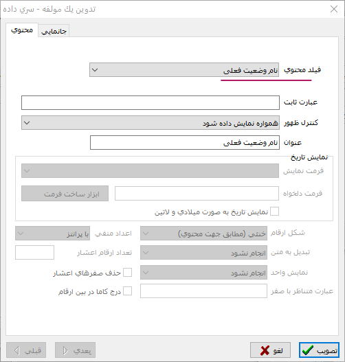 در این محاوره، فیلد سطح بندی و نوع عملیات تجمعی برای این فیلد را تعیین می کنیم. در این مثال همانطور که در شکل های زیر نمایش داده شده است، فیلد محتوا را "نام وضعیت فعلی" و عملیات تجمعی را از نوع "تعداد" تعیین می کنیم: