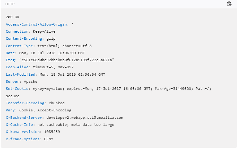 پاسخ سرور، حاوی هدر شامل اطلاعات تکمیلی در مورد پاسخ است. اطلاعاتی مانند سرور، نوع رمزگذاری، تاریخ، نوع محتوا و ... در شکل زیر یک نمونه از هدرهای پاسخ به یک درخواست GET را مشاهده می کنید: