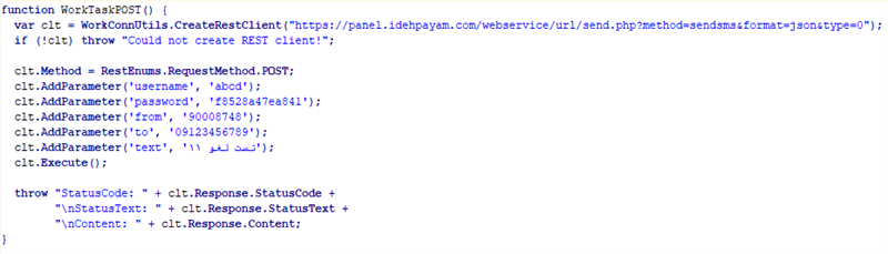 در این مثال نیز مانند مثال قبل، می خواهیم درخواست ارسال پیامک را با متد POST ارسال کنیم اما با این تفاوت که در این مثال، وب سرویس از نوع REST است و به همین دلیل بدنه داده های لازم برای ارسال پیامک را با ساختار JSON تعیین و ارسال می کنیم.
