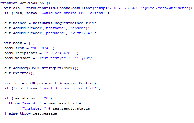 بطور کلی، سیستم مدیریت فرایندها برای اتصال به وب سرویس ها از تابع CreateRestClient از موجود WorkConnUtils استفاده می کند. الگوی این تابع به شکل زیر است: