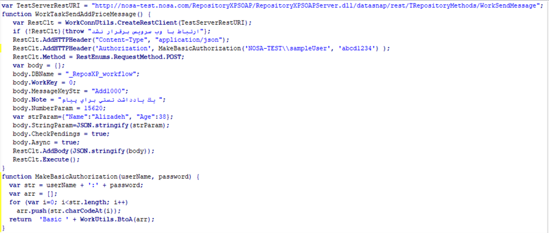 در سطر اول، نوع محتوای درخواست تعیین می شود که به فرمت applicatio/json می باشد و در سطر دوم نحوه احراز هویت در سرور مقصد مشخص می شود. در این مورد خاص، روش احراز هویت به روش Basic است و نام کاربری و کلمه عبور با الگوی userName:password و با کدینگ Base64 به تابع پاس می شود. در واقع این Header به شکل زیر تعیین می شود:
