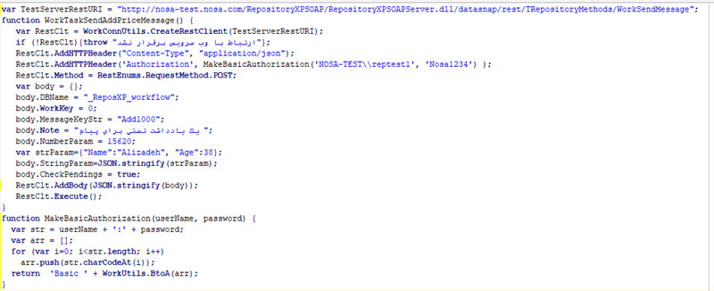 در این مثال فرض شده است که یک شرکت نمونه، سرویس REST استعلام قیمت را برای مشتریان راه اندازی کرده است و لذا هر مشتری اگر مثلا نام کالا را به عنوان پارامتر حرفی ارسال کند، سیستم بطور اتوماتیک تابع WorkProcessMessage را با کلید حرفی Quotation اجرا کرده و قیمت را برای مشتری ارسال خواهد کرد.