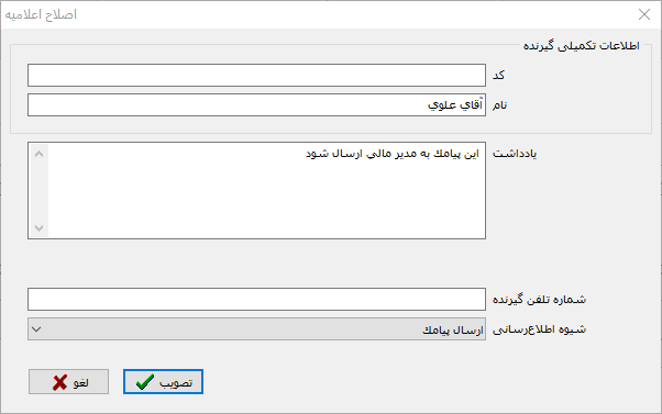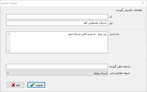 نکته مهم: توجه کنید که در این محاوره تنها فیلدهای شماره تلفن/آدرس ایمیل گیرنده و شیوه اطلاع رسانی قابل ویرایش است و موارد دیگر شامل کد گیرنده ، نام گیرنده و یادداشت قابل ویرایش نیستند و تنها کارکرد توصیفی و دارند و برای راهنمایی کاربر نمایش داده می شود.