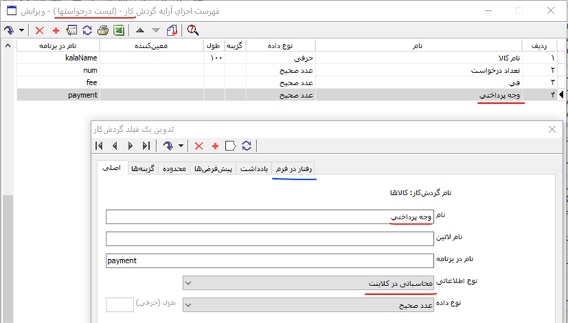 ملاحظه می کنید که ستون وجه پرداختی در این آرایه خالی است. برای محاسبه و پر کردن اتوماتیک این ستون، می توانید همانند شکل زیر، فیلد "وجه پرداختی" را از نوع "محاسباتی در کلاینت" تعریف کنید: