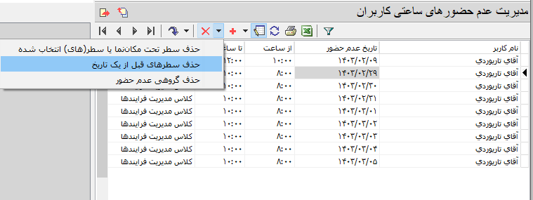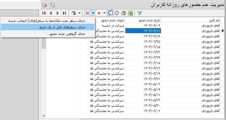 - حذف سطرهای قبل از یک تاریخ: اگر می خواهید کلا عدم حضورهای قبل از یک تاریخ مشخص را حذف کنید، همانند شکل زیر، روی فلش سمت راست آیکون X در نوار ابزار کلیک کنید و از فهرست بازشده، گزینه "حذف سطرهای قبل از یک تاریخ" را کلیک کنید: