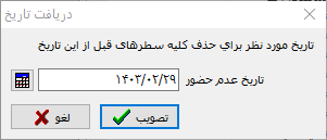 حال در قسمت تاریخ عدم حضور، تاریخ مورد نظر خود را درج کنید و سپس محاوره را تصویب کنید تا تمام عدم حضورهای روزانه قبل از این تاریخ بصورت گروهی حذف شود.
