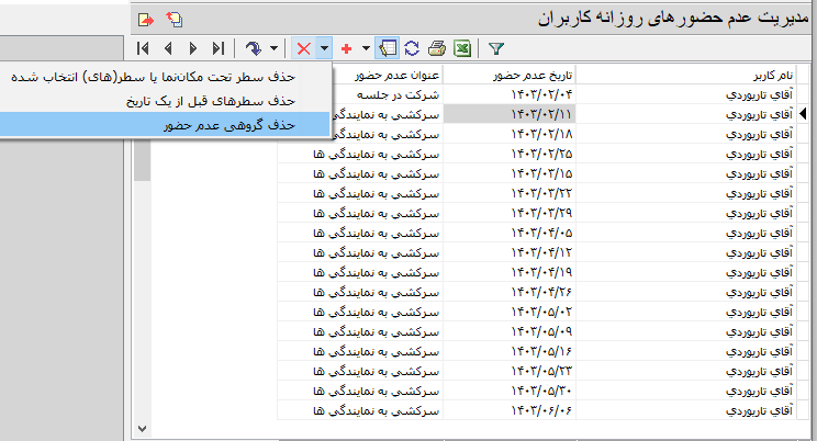 - حذف سطرهای عدم حضور: با کلیک روی آیکون X در نوار ابزار، می توانید سطر تحت مکان نما یا سطرهای انتخاب شده را حذف نمایید.