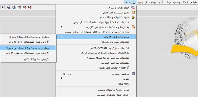 برای مدیریت عدم حضورهای ساعتی باید مطابق شکل زیر، از منوی سیستم، گزینه "عدم حضورهای کاربران" و سپس از فهرست بازشده، گزینه "ویرایش عدم حضورهای ساعتی کاربران" را کلیک کنید: