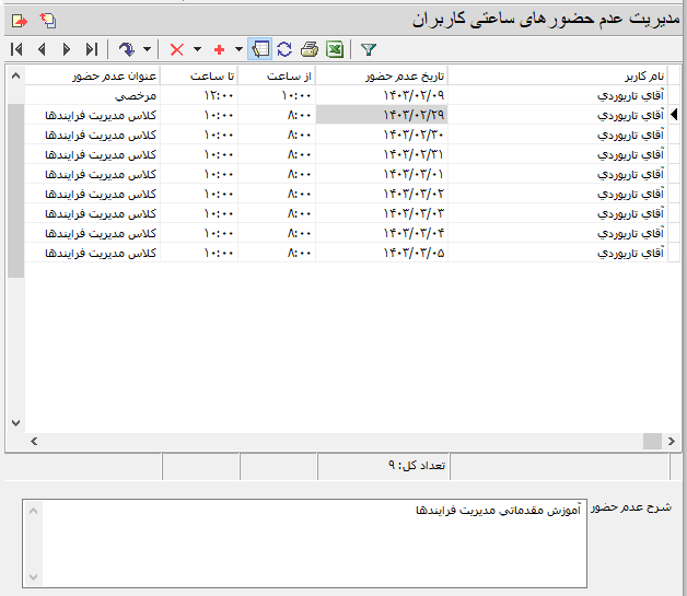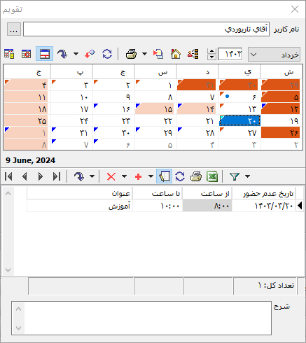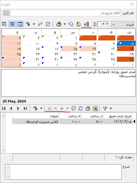 در نوار ابزار انجام می شود. در هر صورت، با انتقال نشانگر به هر روز خاص، فهرست عدم حضورهای ساعتی آن روز در ناحیه پایین محاوره نمایش داده می شود.